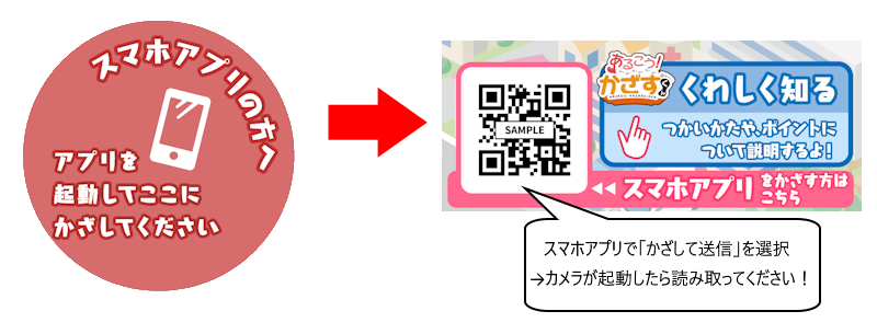 ICカードをかざしてポイントを獲得していた方も、アプリの「かざして送信」からQRコードを読み取ることでポイントを獲得できます。