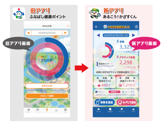 旧アプリ「ふなばし健康ポイント」は2026年06月30日(火)をもってサポート終了となります。それまでに新アプリへの切り替えをお願いいたします。